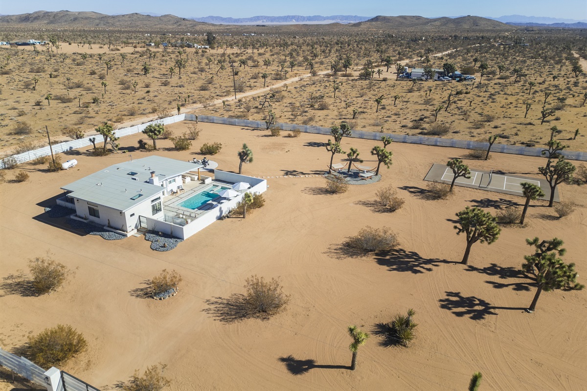 As the sun dips below the horizon, casting hues of orange and purple across the vast expanse, the property's seclusion takes center stage. Situated on five acres, this haven of privacy is guarded by an automatic gate, ensuring an exclusive and secure experience. The silence of the desert envelops you, broken only by the gentle rustling of the Joshua trees that stand as silent sentinels, their unique forms telling stories of resilience and time.